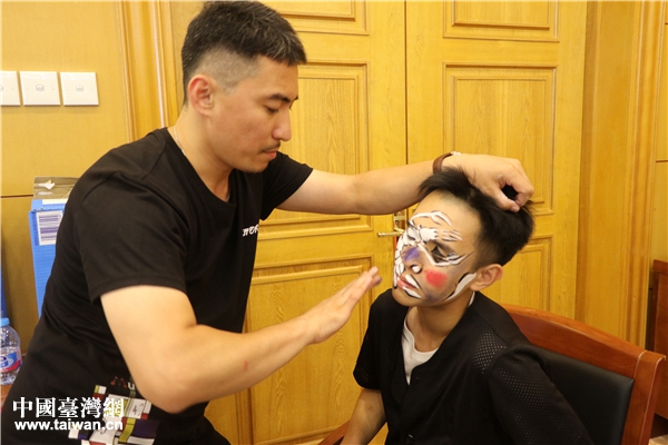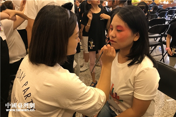 京劇老師為大陸青年化妝。(中國臺(tái)灣網(wǎng) 趙苗青 攝)