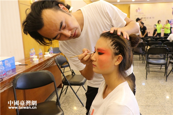 京劇老師為臺(tái)灣青年化妝。(中國臺(tái)灣網(wǎng) 趙苗青 攝)