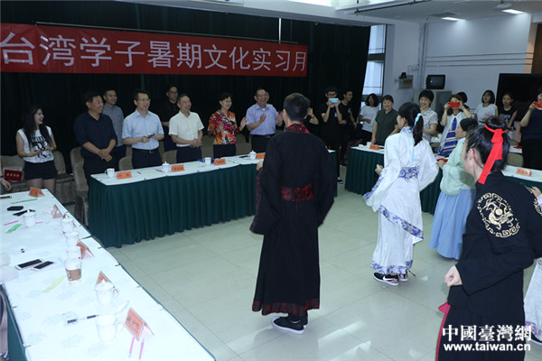 在閉幕式上,兩岸青年學生準備了精彩的節目表演。圖為在中山音樂堂實習的6名實習生表演臺灣健身操節目,參加活動的領導和老師也跟著學跳。(中國臺灣網 郜利敏 攝)