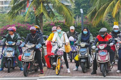 一月九日,海口鐘樓附近,騎車出行的人們穿著厚厚的冬衣。