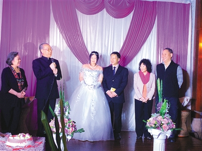 12月27日,在兩岸詩人黑俠和龍青的婚禮上。著名播音藝術家方明(左二)、著名海洋詩人汪啟疆(右一)分別攜夫人擔任證婚人。本報記者 蔡倩 攝