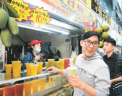 來自海峽兩岸的媒體記者12月18日起在海南省展開“一帶一路”、瓊臺合作專題采訪。記者18日在臺商經營的海口泰龍城瓊臺小吃街采訪在此創業的臺灣青年。家在臺北的廖信翰留學畢業后落戶海口,用臺灣夜市的模式將自己的4個攤檔經營得生意紅火。圖為廖信翰正在招呼客人。