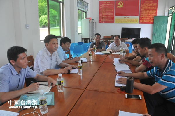 海南省臺辦主任劉耿在扶貧聯(lián)系點與村鎮(zhèn)干部共同研究扶貧工作。(圖片來源:海南省臺辦)