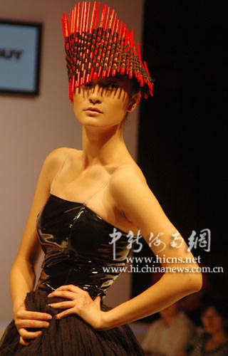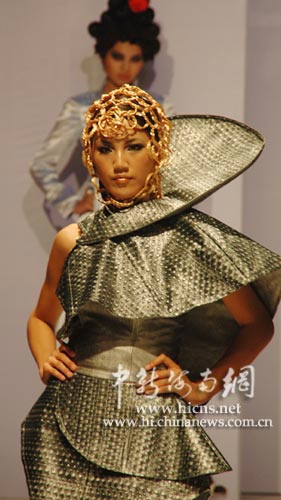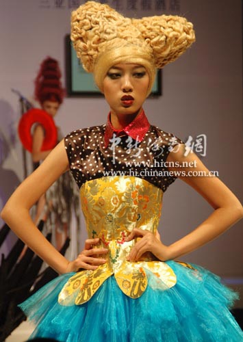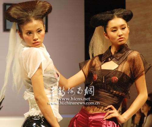 中新海南網12月4日電 (記者 尹海明)12月4日晚,正在海南三亞舉行的2008新絲路中國模特大賽總決賽賽事活動上,舉行一家造型品牌新款發布會。圖為參賽模特展示新款發型。
