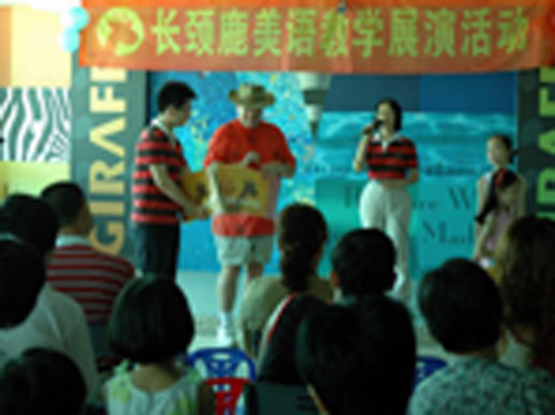 圖為臺灣長頸鹿美語?诜中5囊淮谓虒W展示活動。手持話筒者為林秀珠校長。