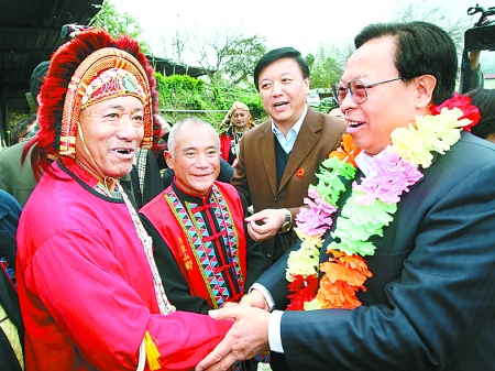 上午11時許,率團參加“中原文化寶島行”活動的中共中央委員、河南省委原書記、省人大常委會主任徐光春一行經(jīng)過三個多小時的長途跋涉,來到了大山深處的特富野社區(qū)。一下車,美麗的阿里山姑娘們就跑上前去,將精心制作的花環(huán)掛在貴賓們胸前。身著鮮艷的民族傳統(tǒng)服裝的村民們用最熱烈的掌聲和歡呼聲歡迎遠方的客人。村口鳴放起只有重大節(jié)日才登場的禮炮,“歡迎你們!歡迎親人們回家!”真誠的問候此起彼伏,大家都是第一次見面,都是剛剛相識,卻像多年不見的家人一樣熱情地握手、緊緊地?fù)肀А?/P>
