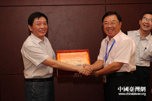 湖北省臺辦主任劉凱春向臺灣客人贈送紀念品。(湖北省臺辦 陸勝 攝)