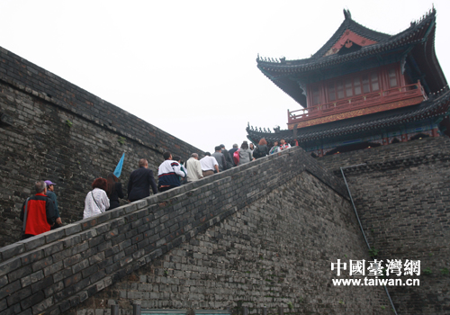 兩岸新媒體荊楚行采訪團來到古城墻內。(中國臺灣網 段雯婷 攝)