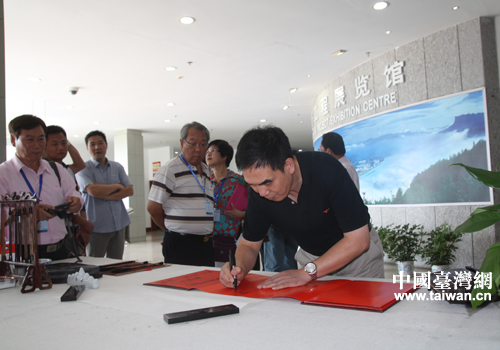 湖北省臺辦宣傳處處長伍洋在三峽工程展覽館留下筆跡。(中國臺灣網 段雯婷 攝)