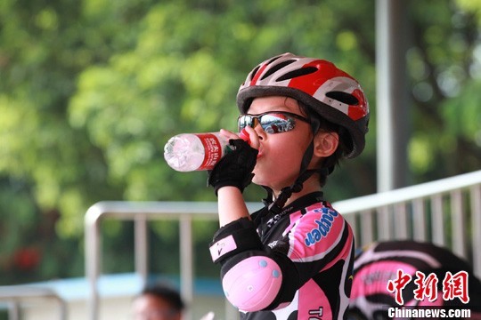 圖為一位輪滑少年在運動后補充水分。中新社發 李克祥 攝