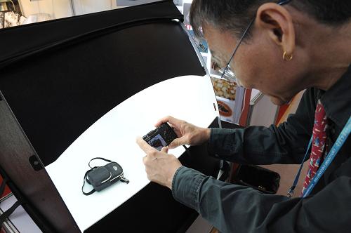 10月17日,一位采購商在試用臺灣產的迷你型攝影棚。在第106屆廣交會上,我國臺灣參展企業積極開拓大陸市場,參展企業數量達到52家。新華社記者 盧漢欣 攝