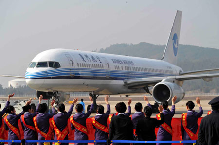 在兩岸定期航班實施之后,廈航的航班量居大陸第四位,僅次于東航、南航、國航三大航空公司。目前廈門航空公司在廈門、福州、杭州、長沙4個航點每周執行11個往返班次的兩岸航班,其中廈門—臺北松山每周4班(往返),福州—松山每周4班(往返),杭州—桃園每周1班(往返),長沙—桃園每周2班(往返)。日前廈航申請加密這4個航點的航班,從農歷臘月二十七開始到正月十五,廈門航空已申請加開廈門至臺北松山機場、福州至臺北松山機場8個班次,往返閩臺的兩岸同胞出行更加方便了。