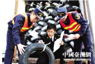 太倉(cāng)海關(guān)關(guān)員對(duì)出口臺(tái)灣的輪胎進(jìn)行現(xiàn)場(chǎng)檢驗(yàn)。圖片來(lái)源:太倉(cāng)臺(tái)辦