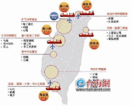2013年,臺“行政院”核定了“自由經濟示范區規劃方案”,希望透過“六海一空一農技”的規劃,將自由貿易范圍由“區內”逐漸擴大到全臺灣。也就是說,“六海一空一農技”是臺灣走向自由貿易的基石和起點。在這個提法之中,除去屏東農業生技園區之外,其他“六海一空”恰好是臺灣最為重要的海運和空運港口所在地。在臺當局自由經濟示范區的兩階段推動計劃中,今年8月啟動的第一階段規劃強調在“六海一空”自由貿易港區內采用“前店后廠”概念,在智慧運籌、農業價值運銷及國際產業合作等領域,促進人員、商品與資金自由流動。