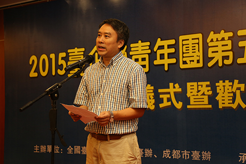 成都市臺(tái)辦主任戴浚在2015全國(guó)臺(tái)企聯(lián)青年團(tuán)四川研習(xí)營(yíng)開(kāi)營(yíng)儀式上致歡迎辭。