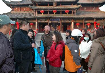 2月19日下午,來自臺灣的游客正在臨汾堯廟廣運殿前聽導游講解先祖堯王的故事以及堯廟的來由。