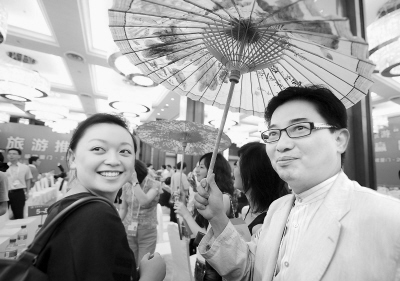 圖為臺商張朝宗(右)在洽談會上推介臺灣旅游產品。(新華社記者 張國俊攝)