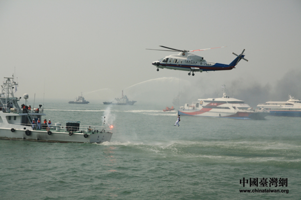 “大三通”以來,兩岸首次大規模海陸空聯合搜救演練16日上午在廈門、金門附近海域舉行。(中國臺灣網 肖燕 攝)
