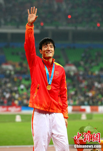 11月24日,廣州亞運會男子110米欄決賽,劉翔以13秒09的成績奪得金牌,這一成績打破了亞運會紀錄。劉翔以一場酣暢淋漓的勝利宣告了自己的回歸。圖為頒獎臺上的劉翔。中新社記者 富田 攝