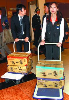 花蓮縣長傅昆萁中午轉交大陸首善陳光標捐贈臺灣5縣市的善款,一早縣府人員從車內搬出4箱裝著現金的紙箱,到臺“立法院”等候各縣市代表前來當面點交。圖片來源:臺灣《聯合報》