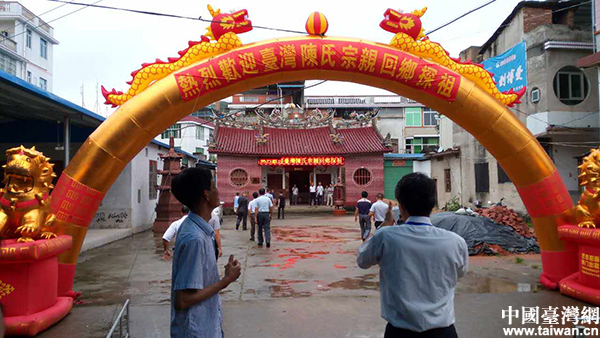 漳州南靖縣金山鎮霞涌村徑尾陳氏宗祠前大陸宗親搭起了歡迎彩門。(中國臺灣網 發)