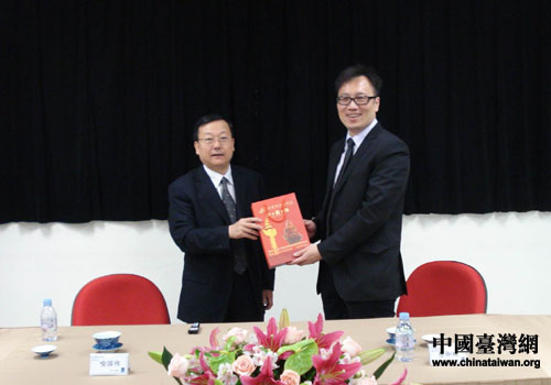 撫順市委副書記喻國(guó)偉向臺(tái)灣藍(lán)天集團(tuán)項(xiàng)目開(kāi)發(fā)經(jīng)理徐御綸贈(zèng)送禮品。(圖片來(lái)源:撫順市臺(tái)辦)