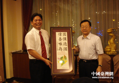 臺灣青年企業家交流協會會長向喻國偉贈送紀念品。(圖片來源:撫順市臺辦)