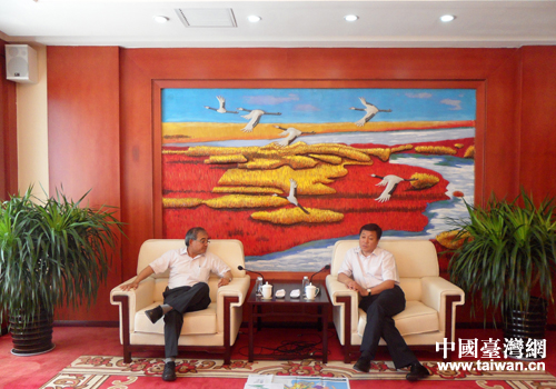 臺灣見龍機(jī)構(gòu)總經(jīng)理洪介文同盤錦市常務(wù)副市長高科進(jìn)行洽談。(盤錦市臺辦 李賀 攝)