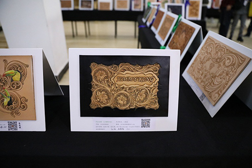 中國首屆A4皮雕藝術大賽巡回展在大連工業大學盛裝啟幕。圖為展會現場。(遼寧省臺辦供圖)