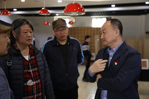 兩岸專家進行交流(左二為臺灣皮雕大師李榮宗,右一為大連工業大學副校長任文東)。(遼寧省臺辦供圖)