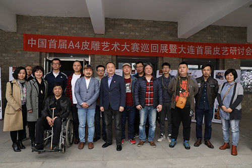 中國首屆A4皮雕藝術大賽巡回展與會嘉賓合影。(遼寧省臺辦供圖)