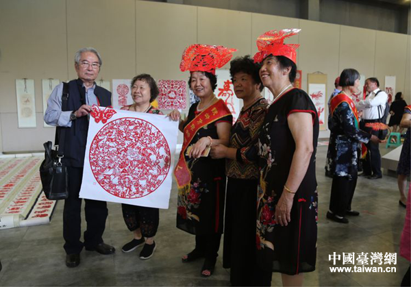 臺灣客人與民間剪紙藝術家合影留念。(圖片來源:鐵嶺市臺辦)
