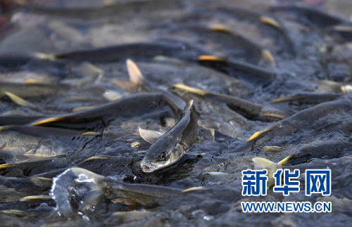 6月6日,當(dāng)?shù)厝罕妼⑶嗪:沲庺~苗投放到布哈河。新華社記者 周喆 攝