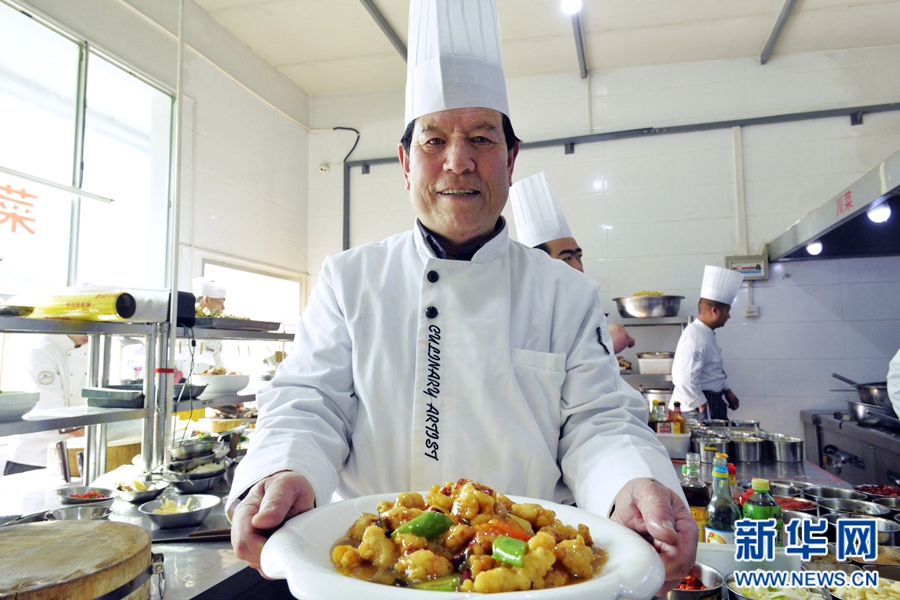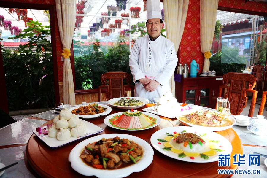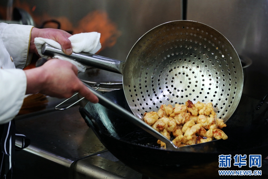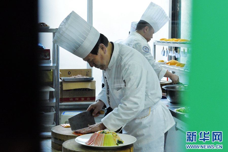 透過櫥窗,范增福和他的徒弟們正在廚房里準備食材。新華網 王小龍攝