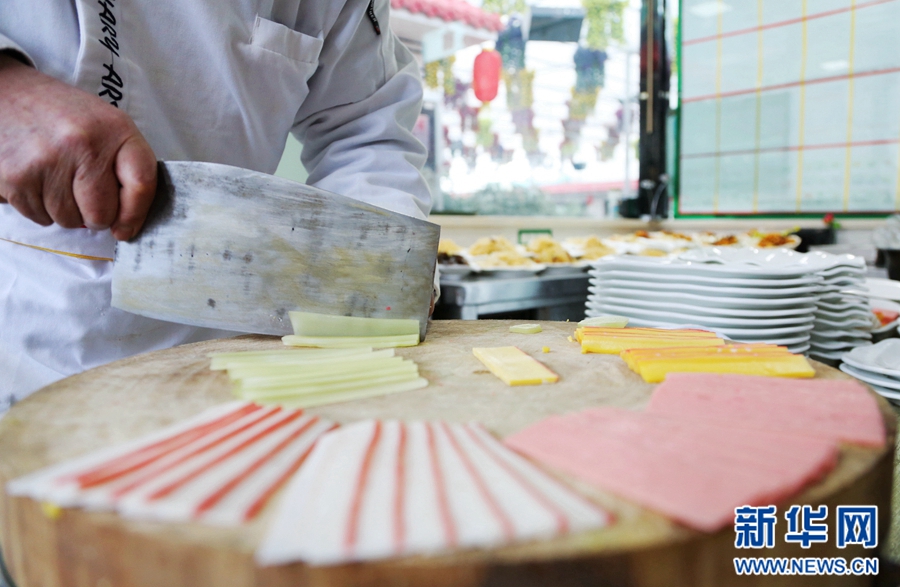 在青海“老八盤”中,最具代表的一道菜就是全盤,是由熟菠菜、肉絲、熟豆芽、粉絲、胡蘿卜和肉片、筍片、午餐肉和熟雞蛋等組成的涼菜拼盤。范增福正在將擺盤的食材切成長方形。