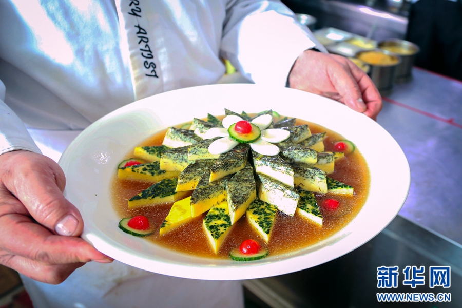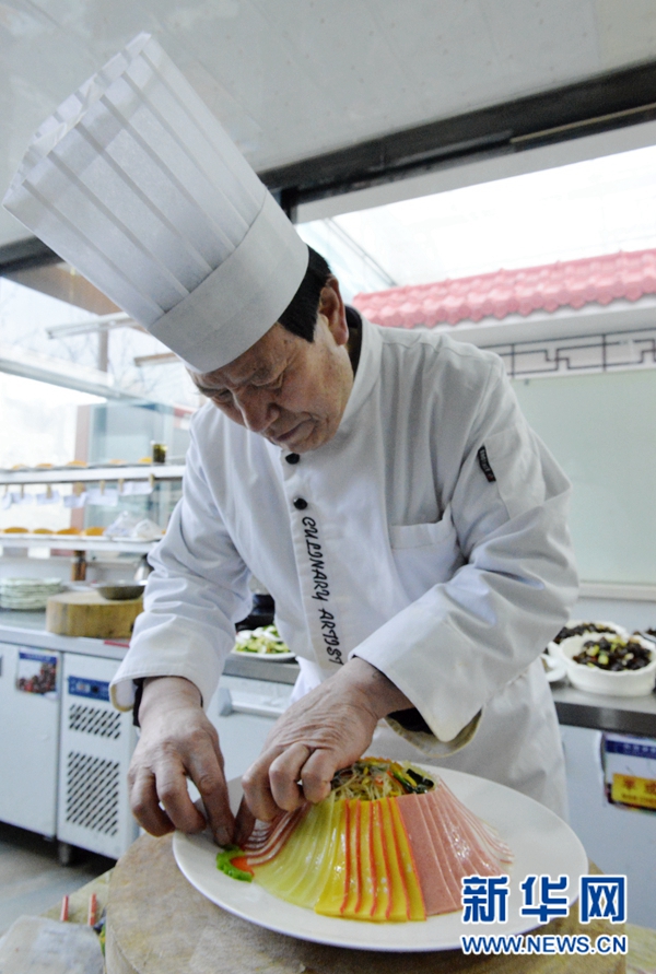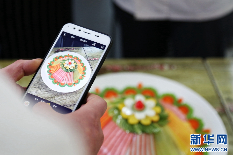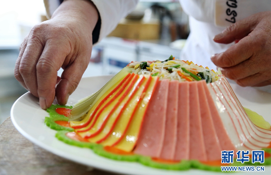 范增福正在細心地擺盤。“全盤的制作非常講究,拼盤的食材都要切得整齊劃一,擺出來才最好看。”范增福說。