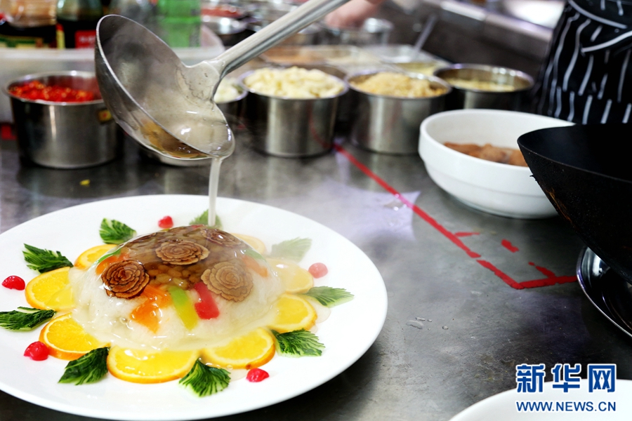 范增福正在給八寶飯澆汁。八寶飯作為“老八盤”中的熱菜之一,因其香甜的味道與軟糯的口感深受食客們的喜愛。