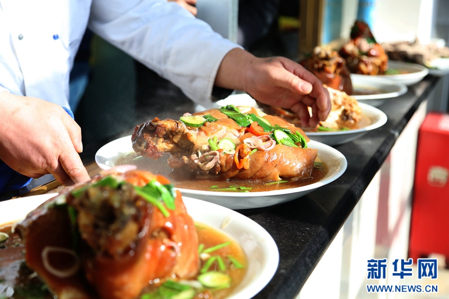 “老八盤”中的又一道經典菜——霸王肘子出鍋裝盤。這道菜肉質酥爛,老少咸宜。