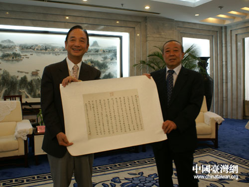 焉榮竹書記向鄭逢時贈送書法藝術作品。來源:濟南市臺辦