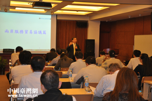 中國臺(tái)灣網(wǎng)11月4日上海消息 “兩岸服貿(mào)協(xié)議”商機(jī)在哪里?哪些產(chǎn)業(yè)臺(tái)商可以優(yōu)先進(jìn)入?臺(tái)商如何開拓大陸服務(wù)業(yè)市場?1日下午,圍繞臺(tái)商在大陸展開的經(jīng)貿(mào)實(shí)務(wù)研討交流活動(dòng)在上海臺(tái)協(xié)會(huì)舉行。來自臺(tái)灣海基會(huì)“臺(tái)商財(cái)經(jīng)法律顧問”、華信統(tǒng)領(lǐng)企業(yè)管理咨詢有限公司總經(jīng)理袁明義,就上海臺(tái)協(xié)會(huì)員企業(yè)參會(huì)代表關(guān)心關(guān)注的問題作了專題介紹,為臺(tái)商朋友提供“實(shí)務(wù)講解”。