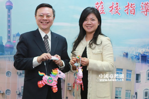 上海臺商子女學校董事長楊奕蘭向王郁琦贈送學生制作的小馬燈。(中國臺灣網 田云鵬)