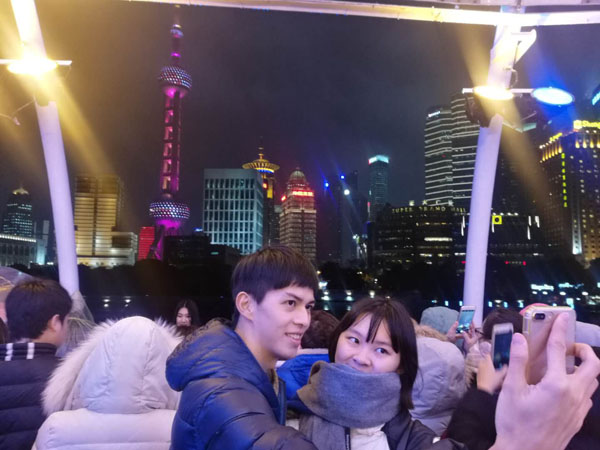 1月21日,臺灣大學(xué)生在黃浦江游船上欣賞夜上海的五光十色。