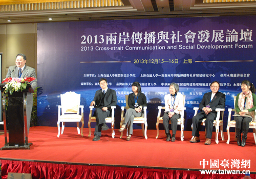 中國臺灣網12月16日上海消息 15日,2013兩岸傳播與社會發展論壇在上海開幕。此次論壇由上海交通大學媒體與設計學院、上海交通大學東森兩岸四地傳播與社會發展研究中心和臺灣永清慈善基金會聯合主辦。150多位教育界、新聞界人士出席論壇。