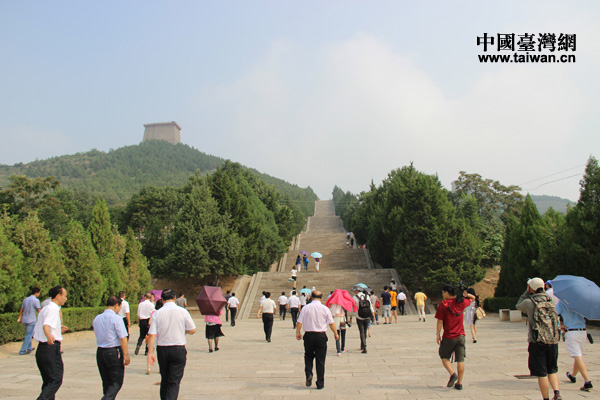 海峽兩岸記者要攀登524級臺階和18個平臺才能到達乾陵入口。(中國臺灣網 王文英攝)