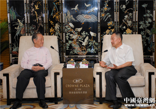 陜西省委常委、省委統(tǒng)戰(zhàn)部部長陳強(qiáng)新黨主席郁慕明。(圖片來源:陜西臺辦)