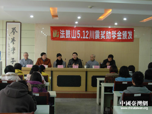 中國臺灣網(wǎng)1月26日綿陽消息 1月25日,臺灣法鼓山慈善基金會果品法師一行為綿陽中學、安縣中學等40名災區(qū)貧困優(yōu)秀學生發(fā)放助學金,并同學們進行親切交流,鼓勵他們堅定信心、自強自立、好好學習。市臺辦主任陳福林出席資助儀式。