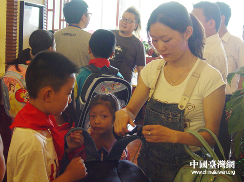 學校老師為受助學生整理書包。(德陽臺辦 甘和林 攝)