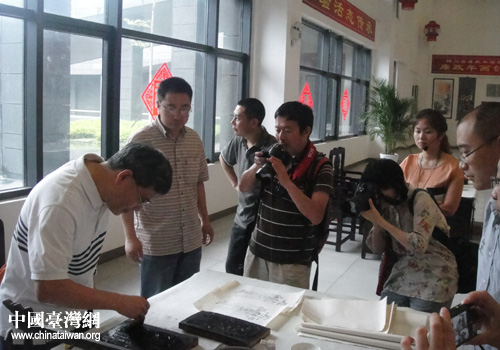 臺(tái)灣“中國時(shí)報(bào)”副總編輯黃樹德體驗(yàn)綿竹年畫上墨印線技法。(圖片來源:德陽市臺(tái)辦)
