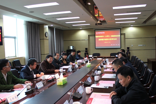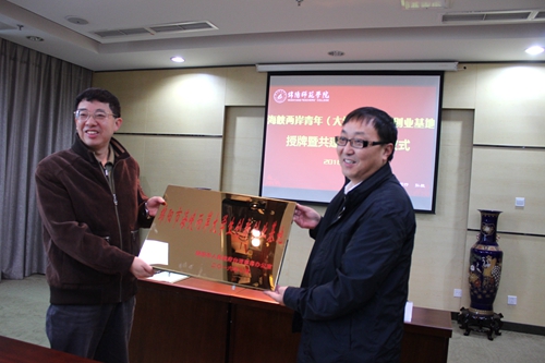 綿陽市臺辦向綿陽師范學院授牌“綿陽市海峽兩岸大學生創新創業基地”儀式在綿陽師范學院舉行。(左為綿陽臺辦主任陳福林、右為綿陽師范學院院長王海濱)