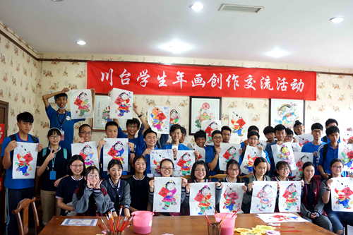 在處處裝點著中國傳統年畫的綿竹年畫村,同學們細心聆聽綿竹年畫的文化傳承、制作流程、工藝技巧、創作理念等介紹,切身感悟到一幅幅經典畫作中所蘊含的民間智慧與精湛技藝。在年畫老師的指導下,臺東高中的同學們爭相一試身手,與綿竹中學的同學們共同創作年畫,描紅、上色,互贈作品作為紀念,描繪出一幅跨越海峽的友誼之圖。